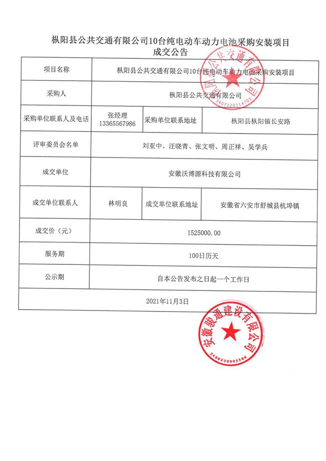 樅陽(yáng)公共交通有限公司10臺(tái)純電動(dòng)車(chē)電池采購(gòu)安裝項(xiàng)目成交公告
